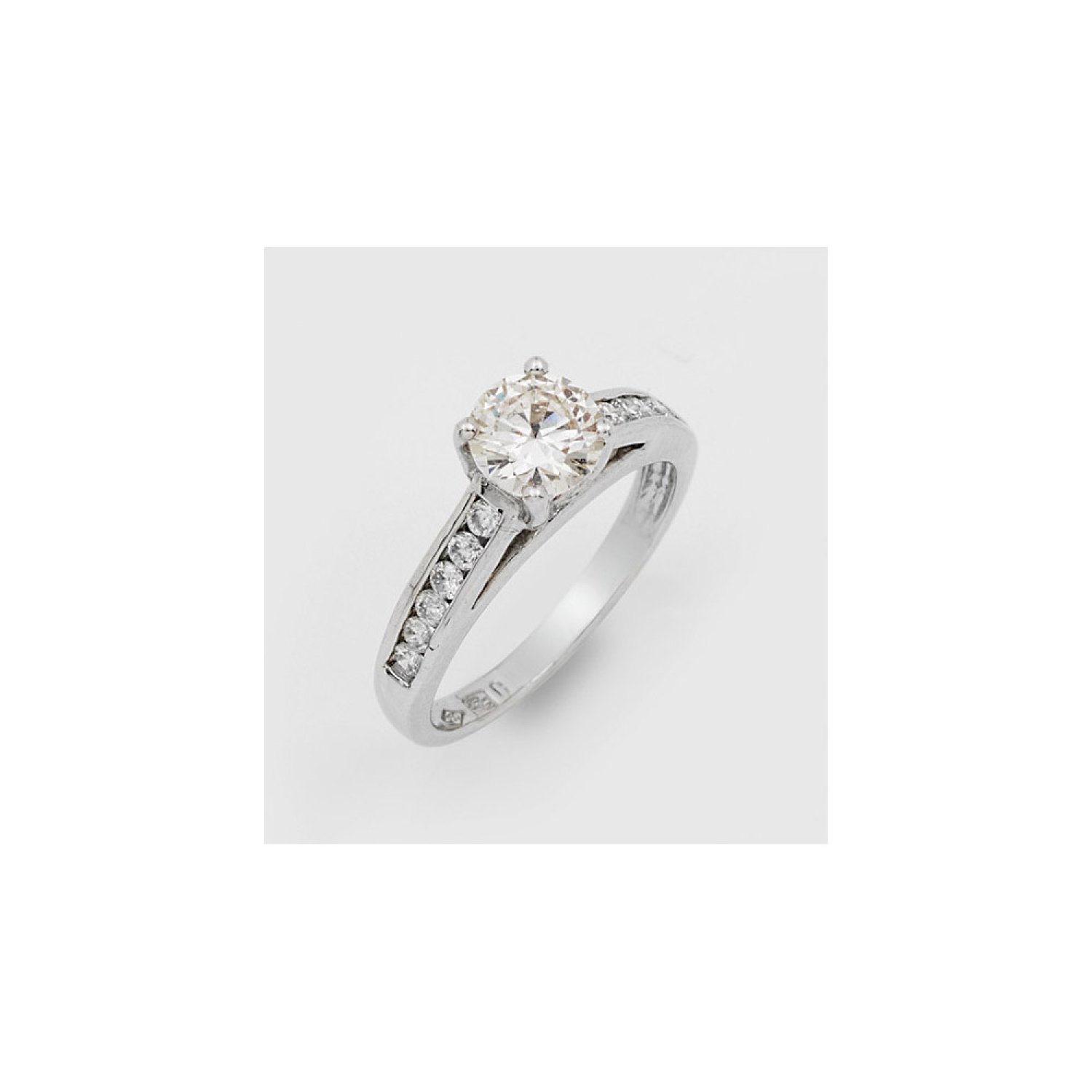 Ring set with a brilliant solitaire approx. 1,04 ct. (G/vsi) and 12 diamonds approx. 0,50 ct. (H/pi), in 18 k white gold.