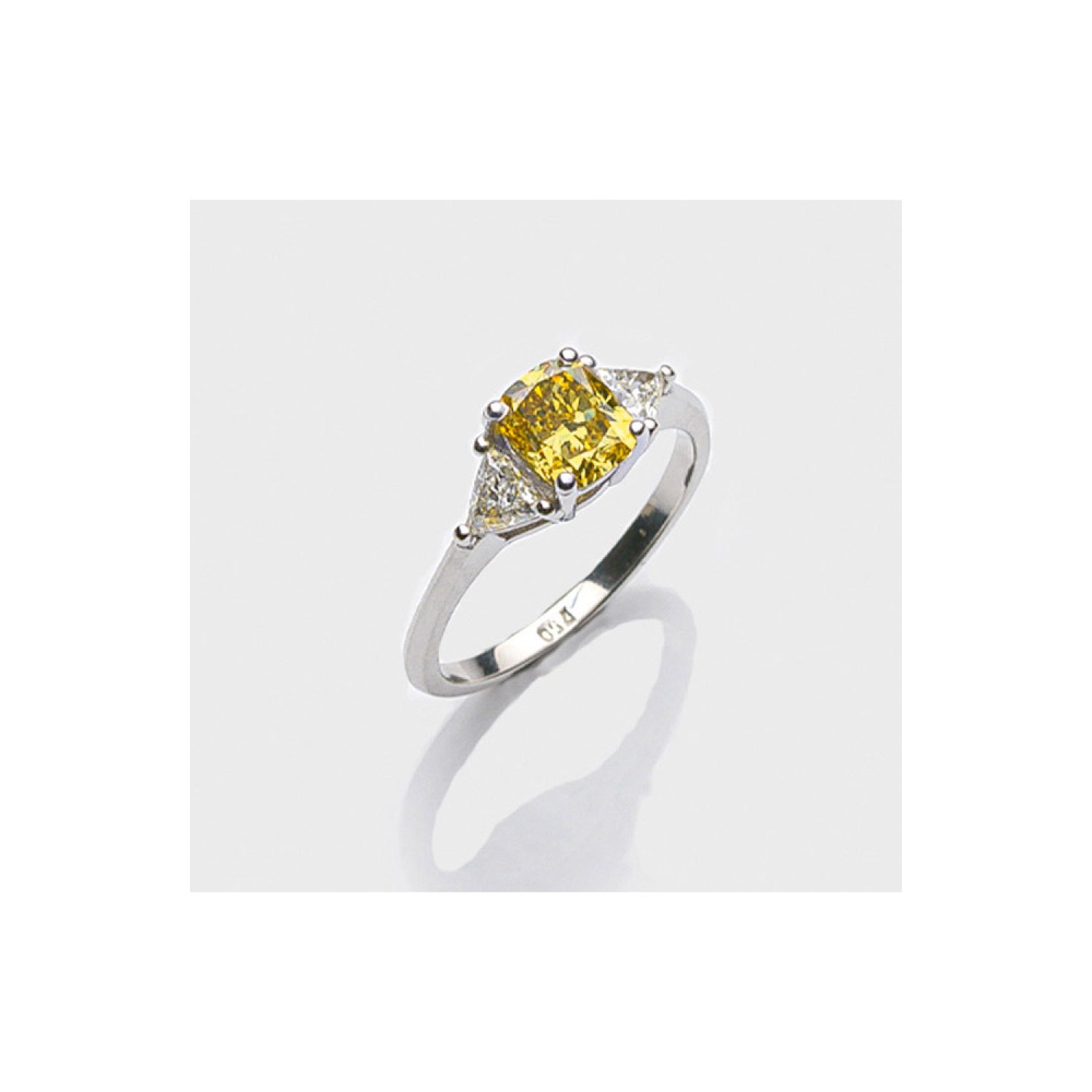Weißgold, gest. 750. Zentral besetzt mit einem Fancy Vivid Yellow-Diamanten von ca. 1,35 ct. (vsi), im Cushioncut, flankiert von Diamanttrillanten von zus. ca. 0,50 ct. (E/si). Gew. ca. 3,13 g.