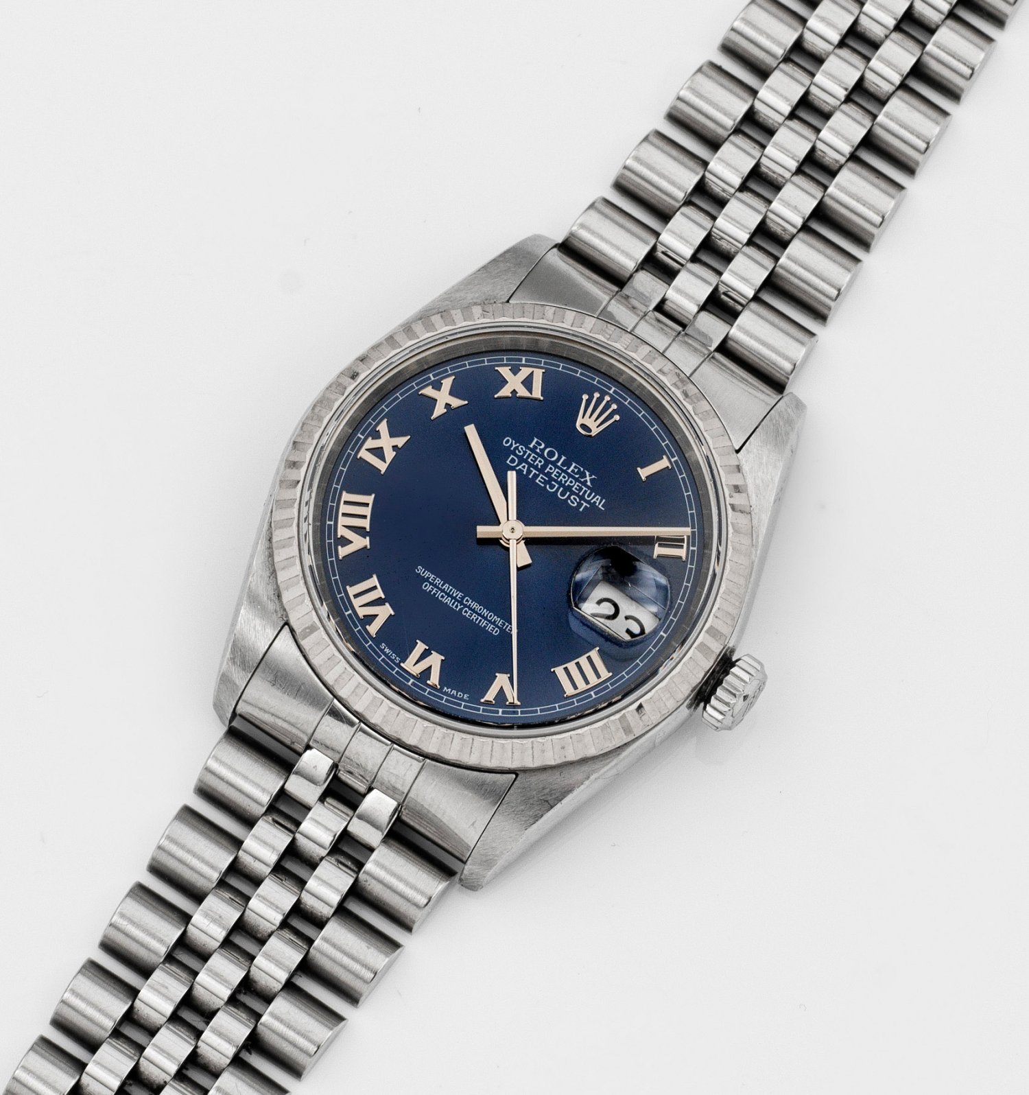 Stahl. Rundes Uhrengehäuse mit geriffelter Lünette. Blaues Zifferblatt mit römischen Indexen, Stabzeigern und Zentralsekunde, Datumsanzeige. Saphirglas mit Lupe über der Datumsanzeige. Jubilee-Armband mit Faltschließe. Automatikwerk, Caliber 3135. Herstellerzeichen. Ref.-Nr. 16234/F028340.