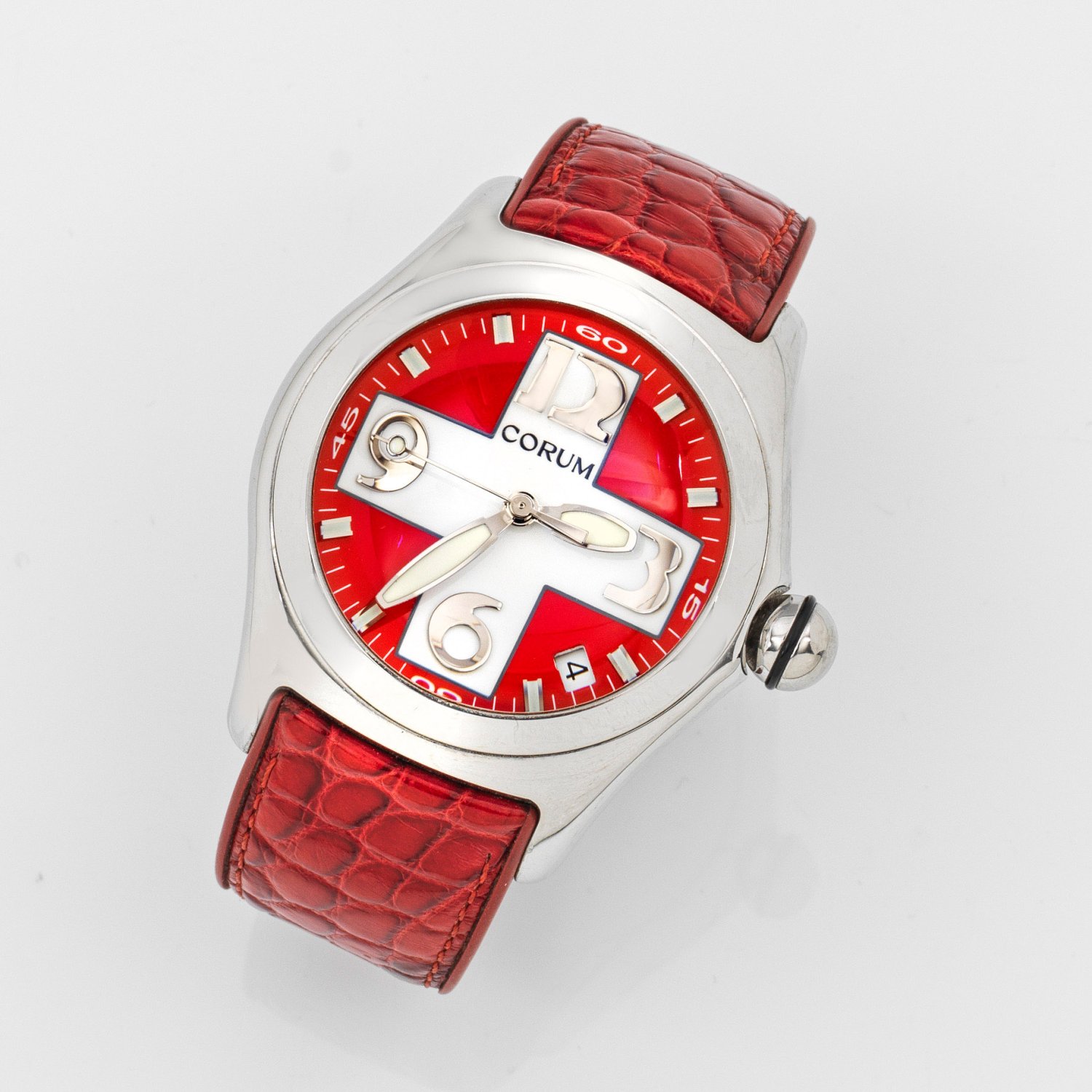 Schweiz. Um 2000. Stahl. Rundes Gehäuse mit breiter Lünette. Rotes Zifferblatt mit weißem Kreuz, arabischen und Strichindexen, Leuchtzeigern und Zentralsekunde, Datumsanzeige und Herstellerzeichen. Konvex gewölbtes Saphirglas. Geprägtes, rotes Originallederarmband mit Doppelfaltschließe. Quarzwerk. Ref.-Nr. 163.150.20 und 658663.