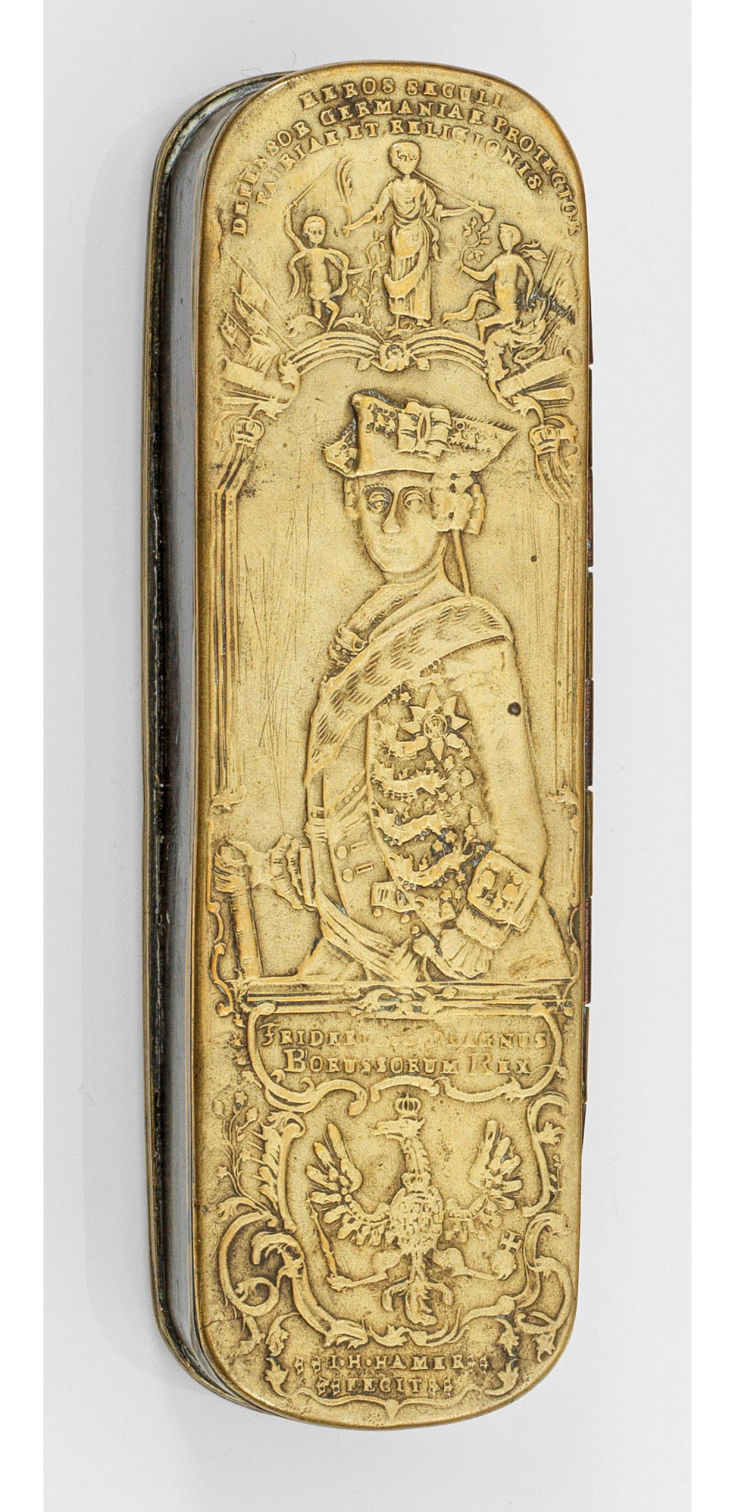 Messing und Kupfer. Oblong mit geprägtem Reliefdekor. Auf dem Deckel Profilbildnis von Friedrich dem Großen in Uniform mit Dreispitz, lat. bez. "Fridericus Magnus Borussorum Rex" über Kartusche mit dem Preussischen Wappenadler, in den Fängen Zepter und Reichsapfel haltend. Oben allegorische Figurendarstellungen mit lat. Inschrift. Rückseitig Darstellungen der Schlacht gegen die Russen bei Zorndorf 1758 sowie das "Bombardement Van Custrin 1758". Deckel und Boden mit Sign. von Johann Heinrich Hamer. H. 2,8 cm. 16 cm x 4,6 cm.