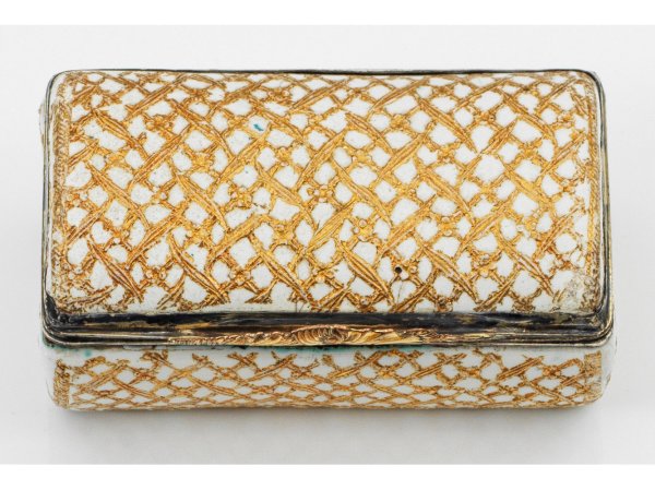 Kupfer, weiß emailliert und teilw. vergoldete Silbermontierung. Konischer, rechteckiger Korpus mit gerundetem Scharnierdeckel und Ecken. Allseitig mit feiner, goldener Emailmalerei netzähnlich in Form von Blattranken und Blüten umzogen. Schmaler, gebogter Drücker verziert mit Rocaillen und Muschelwerk. Rest.; Gest., Pariser Steuerstempel bis 1738. H. 3,5 cm. 7 cm x 4 cm.