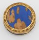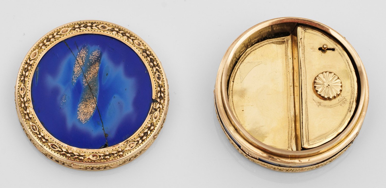 Rotgold und Aventuringlas. Runde Form mit Stulpdeckel. Wandung aus intensiv hell- und dunkelblauem Aventuringlas mit wolkenähnlichen, irisierend kupfer- und goldfarbenen Einschlüssen. Die Ränder gefasst mit zart getriebenen und ziselierten Ornamentbändern, verziert mit Blattranken und Punktedekor. Im Inneren eine kleine herausnehmbare Miniatur-Walzenspieluhr. Innenseiten mit Silberfolie ausgekleidet. Wandung teilw. gerissen; Teilw. undeutl. gest., Pächterstempel Henry Clavel (1783-1789) und Meister Jean-Francois Delanoy (tätig seit ca. 1785), Pariser Beschauzeichen mit Dat.; Gew. ca. 65 g. H. 1,5 cm. D. 4,5 cm.