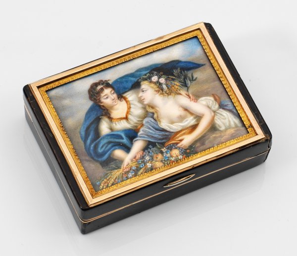 Schildpatt mit vergoldeter Silbermontierung. Rechteckiger Korpus mit Scharnierdeckel. Auf dem Deckel profiliert gerahmte, verglaste, sehr feine allegorische Darstellung von zwei jungen Frauen, in antikisierten Gewändern. Die Dunkelhaarige als Allegorie des Friedens mit Lorbeerblattkranz im Haar und Olivenzweig in der Hand. Sie beugt sich sorgend zu einer blonden Frau mit Ährenkranz im Haar und ein Füllhorn mit Blüten, Ähren und Früchten haltend als Allegorie der Fülle. Nach dem Gemälde "La Paix ramenant l'Abondance" von Élisabeth Louise Vigée Le Brun (1755-1842). Polychrome Temperamalerei. Rep.; Teilw. undeutlich gest., Pariser Garantiemarke von 1819-1838. H. 2,1 cm. 8 cm x 5,7 cm.