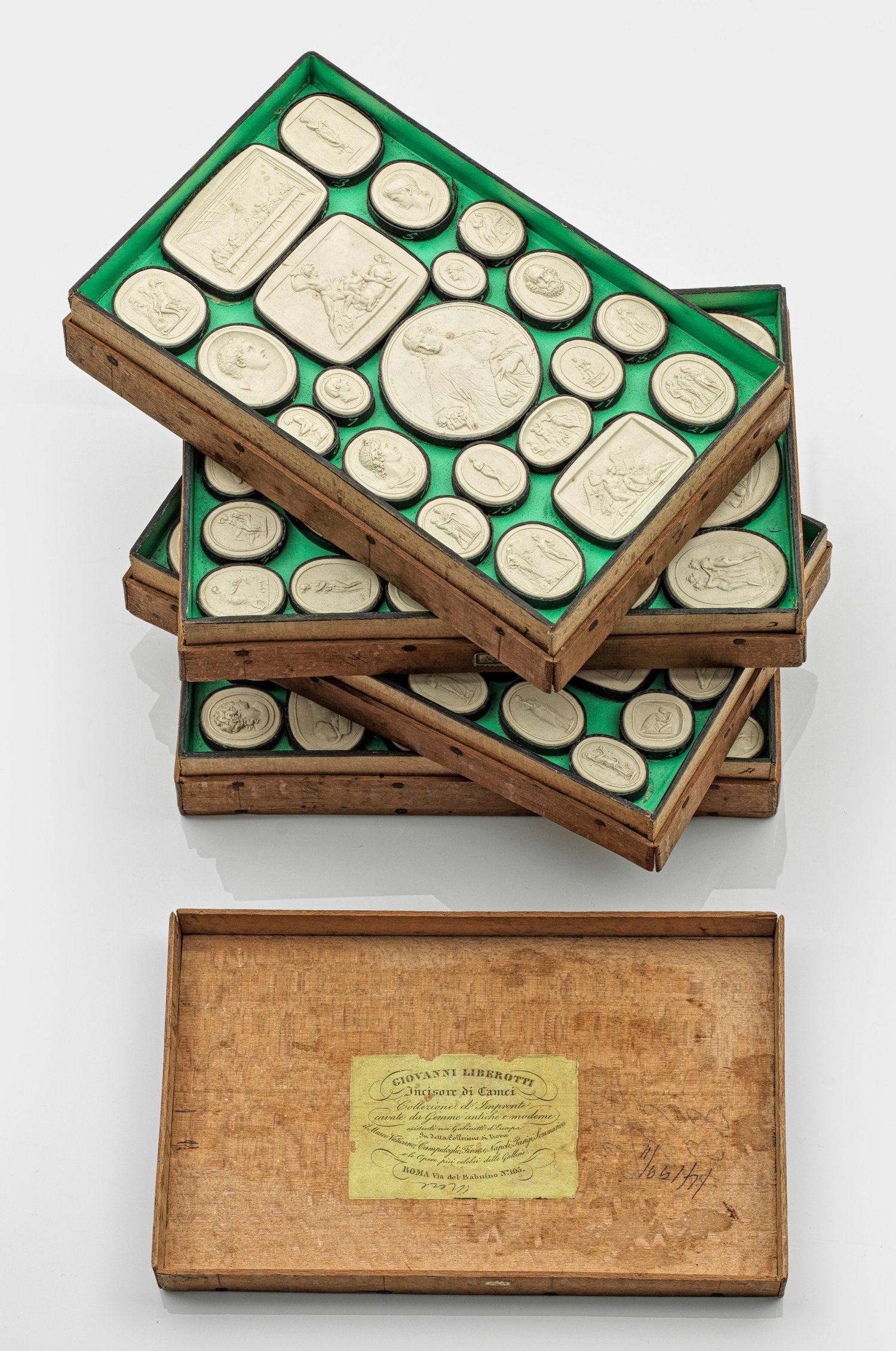 Holz, Papier und Gips. Stapelkasten mit vier Ebenen. Darin vollständige Folge von insges. 102 Gipsmedaillons, nach Meisterwerken von der Antike bis zum 19. Jh. aus großen europäischen Sammlungen in Rom, Florenz, Neapel, Mailand und Paris der Grand Tour. Darstellungen z. B. des Barberinischen Fauns, das Mosaik Tauben auf dem Rand des Wassergefäßes von Soso, das letzte Abendmahl von Leonardo da Vinci, Szenerien mit Amor und Psyche, der Diskobolos von Myron, die Madonna della Sedia von Raffaello Santi, Herkules und der Zentaur von Giovanni da Bologna sowie die Laokoon-Gruppe. Gemmenabdrücke mit schwarzer Fassung und heller Nummerierung über helltürkis-grünem Grund. Teilw. alte Inventaretiketten. Im Deckel Herstelleretikett. Altersbedingte Gebrauchsspuren. H. 13 cm. 23,5 cm x 15 cm.