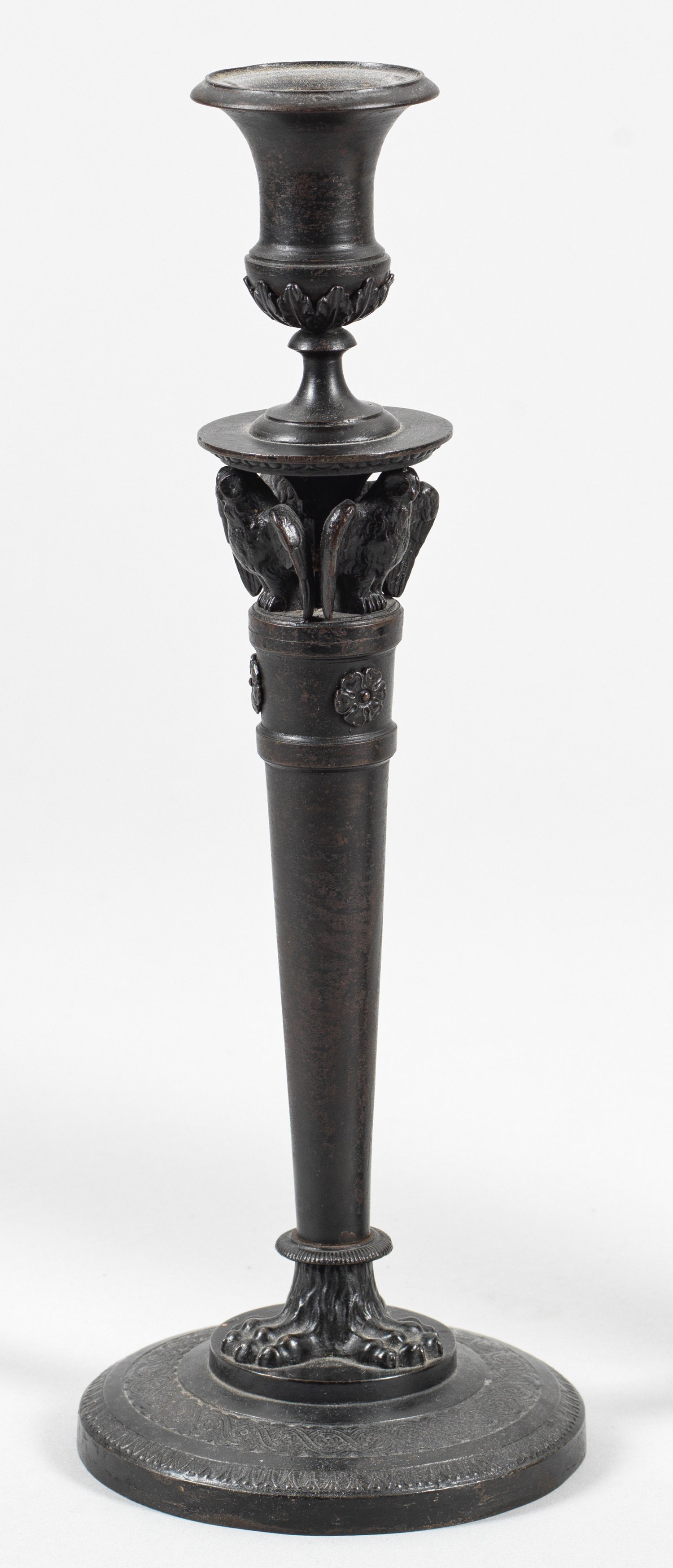 Eisenkunstguss, schwarz patiniert. Von Palmetten und Ornamentband umzogener Rundstand, übergehend in drei stilisierte Löwentatzen. Konisch aufsteigender Säulenschaft mit gerader, durch drei vollplastische Eulen mit ausgebreiteten Flügeln abgesetzter Schulter. Darüber kratervasenförmige Tülle, verziert mit Akanthusblattrelief. H. 31,5 cm.