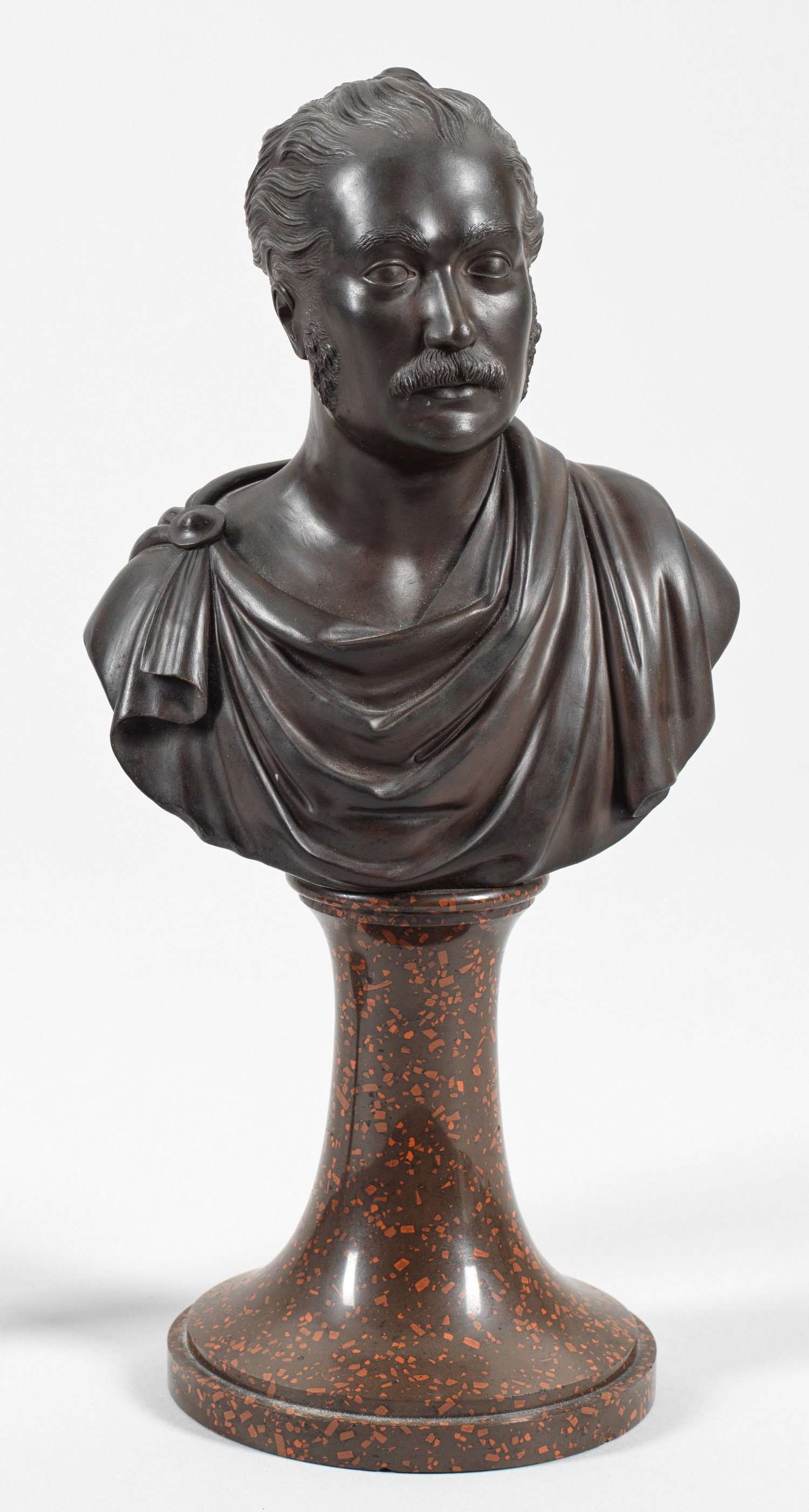 Bronze, dunkelbraun und rostrot patiniert. Über gekehltem, hohem Sockel aus braunem und rotem Stuckmarmor die Porträtbüste von Zar Nikolaus I. von Russland (1796-1855) mit langen Koteletten, fein dargestelltem Haar, Schnurrbart und antikisiertem, drapiertem Gewand um die Schultern gelegt. H. 33,5 cm.