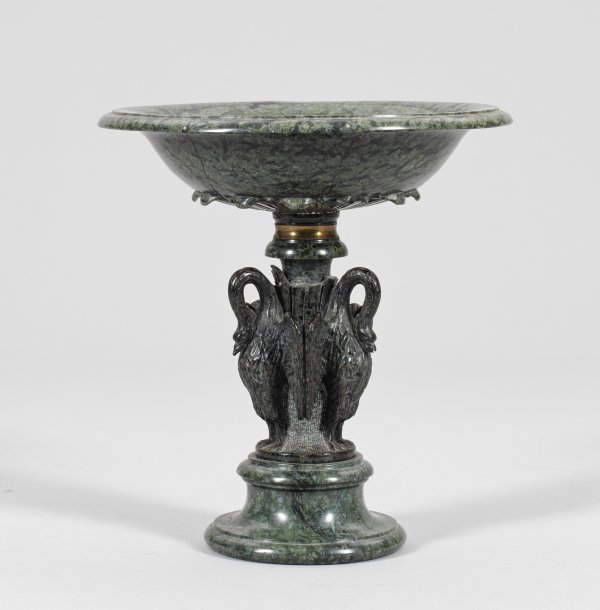 Schwarz und grau gemaserter, grüner Serpentin. Mehrfach profilierter, stark eingezogener Rundfuß, übergehend in Schaft, bestehend aus drei vollplastisch und durchbrochen gearbeiteten, steigenden Schwänen mit ausgestellten Flügeln und stark gebogtem Hals. Darüber gering gemuldete, ausschwingende Schale mit getrepptem Rand über geschnittenem, reliefplastischem Blattkranz und ringförmiger Bronzemontierung. Rest.; H. 24,5 cm. Schalen-D. 23 cm.