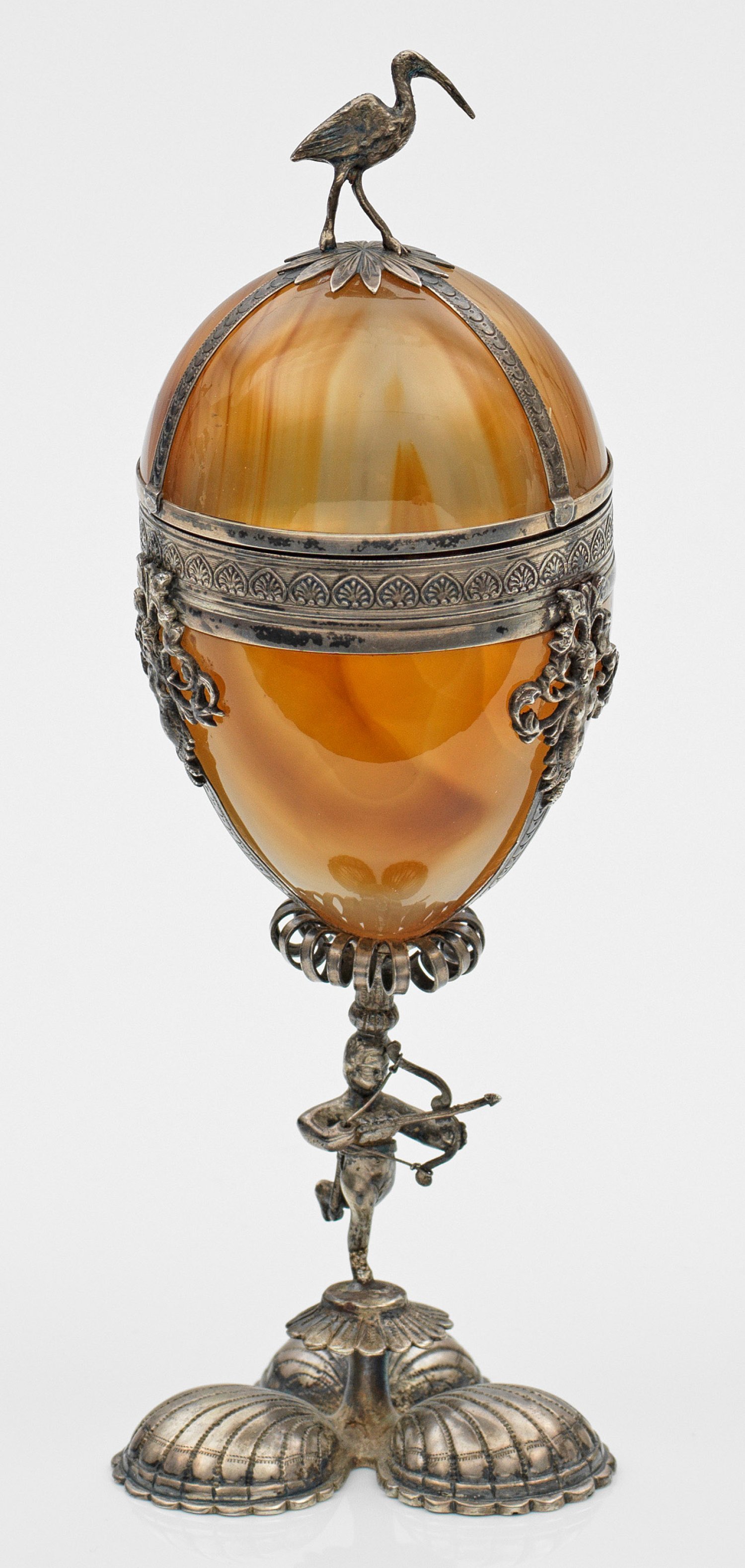Silber und geschliffener Bandachat. Dreipassiger, aus Jakobsmuscheln bestehender Stand mit kurzem Schaft in Gestalt eines vollplastisch gearbeiteten Amors, den Pfeil abschießend. Darüber ovoider Korpus aus durchscheinend dünnem, hell honig- und karamellfarben gebändertem Achat über spiralförmig gedrehtem Kranzansatz. Montierung aus drei vertikalen, ornamentierten Bändern mit durchbrochen gearbeiteten Voluten und Hermendarstellung. Der Rand umzogen von Palmettenfries. Stülpdeckel mit vollplastischem, schreitendem Storch über lanzettblättriger Blütenrosette. Gest. 13 Lot, Herstellerzeichen, Pseudomarken. Gew. ca. 185 g. H. 18 cm.