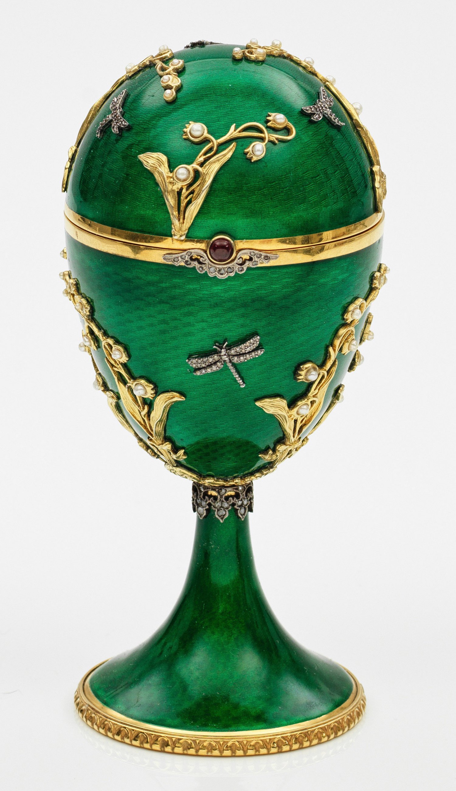 im Stil von Karl Fabergé. Silber, teilw. vergoldet und emailliert. Trompetenförmiger Stand mit reliefiertem Eierstabfries umzogen, übergehend in ovoiden, dunkelgrün emaillierten und wellenförmig guillochierten, scharnierten Korpus. Reiche, filigran durchbrochen gearbeitete Applikationen in Form von Maiglöckchenstielen mit kleinen Perlen als Blüten. In den Zwischenräumen applizierte, mit Diamantrosen ausgefasste Libellen. Schauseitig als Drücker ein gefasster Granatcabochon über Volutenornament. Innen mit beigefarbenem Velours ausgekleidet. Gest. 88. Gew. 445 g. H. 15,5 cm.