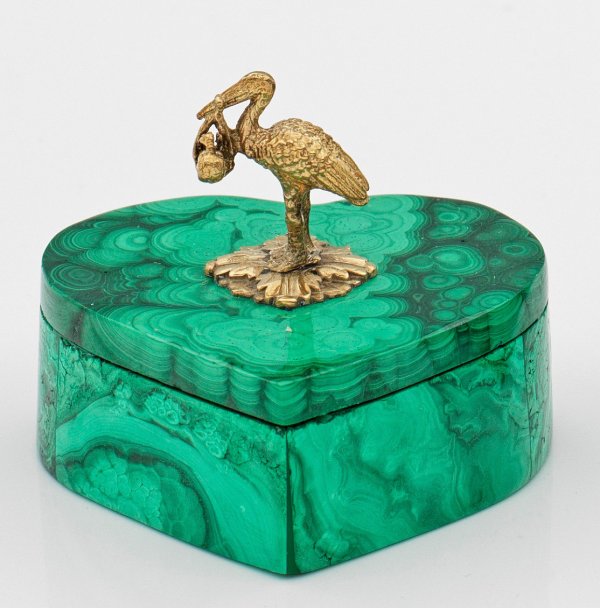 im Stil von Karl Fabergé. Silber, vergoldet. Herzförmiger Korpus mit gerader Wandung. Auf flachem Scharnierdeckel eine reliefierte Blattrosette mit vollplastischer Darstellung eines Storches, ein Kind im Schnabel tragend. Gest. 84. H. 4 cm. 4,8 cm x 4,5 cm.
