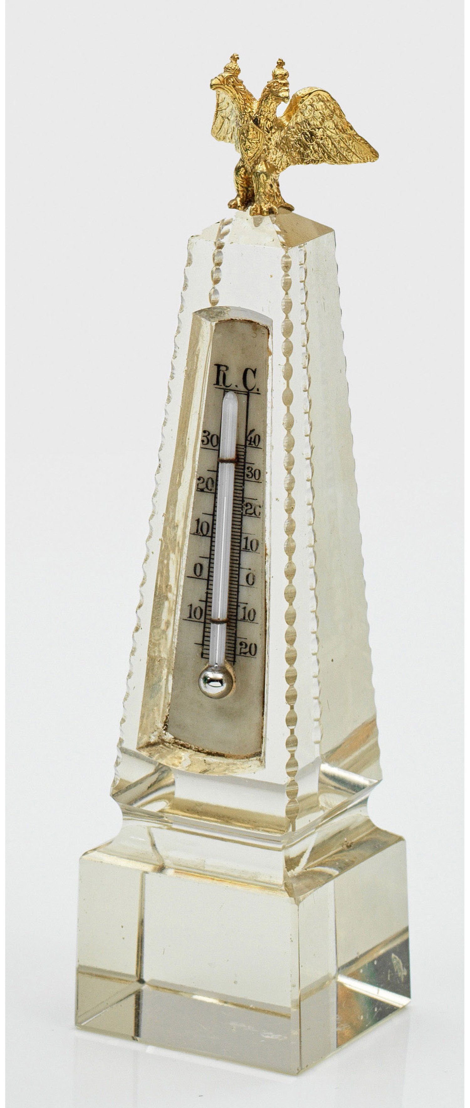 im Stil von Karl Fabergé. Farbloses Glas und Silber, vergoldet. Über quadratischem Sockel ein aufsteigender Obelisk mit eingelassenem Thermometer und Gradzahlskala. Die Kanten mit reliefiertem Dekor verziert. Obenauf ein bekrönter Doppeladler mit ausgebreiteten Flügeln. Gest. 88. H. 16,5 cm. 4,2 cm x 4,2 cm.