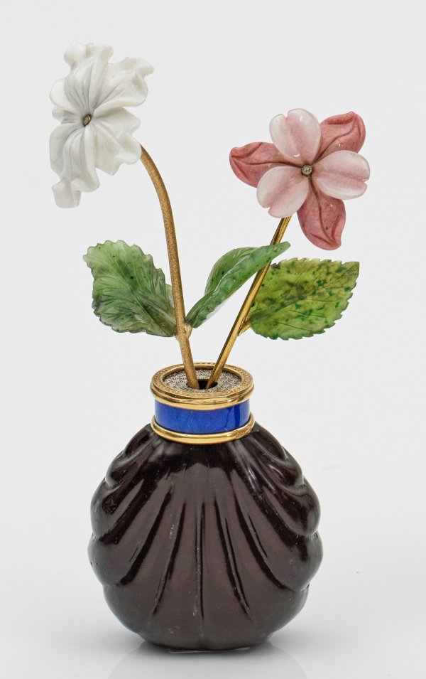 im Stil von Karl Fabergé. Muschelförmig godronierte, schwarze Vase mit vergoldeter Silbermontierung und hellblau umlaufendem Emailleband. Darin zwei herausnehmbare Blütenstängel aus vergoldetem Silber. Die Blätter u.a. aus geschnittenem Nephrit und Bergkristall. Mittig mit kleiner Diamantrose ausgefasst. Gest. 88. H. 13,5 cm.