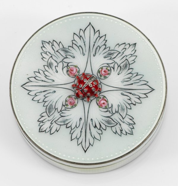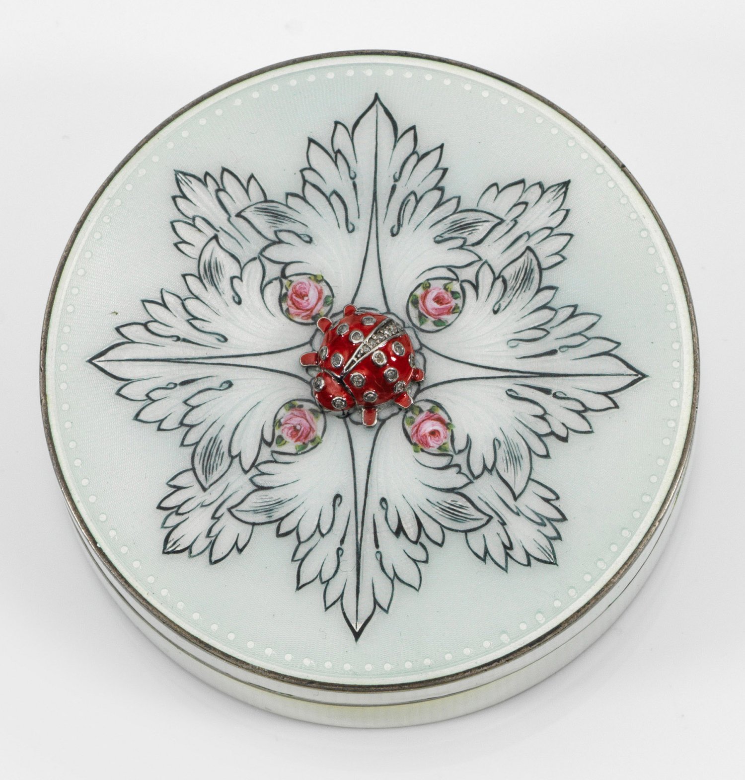 im Stil von Karl Fabergé. Silber, teilw. emailliert. Runde Form mit flachem Deckel. Zentral über einer Blattrosette ein applizierter rot emaillierter und mit Diamantrosen besetzter Marienkäfer, gerahmt von kleinen Rosenblüten. Deckel und Wandung wellenförmig guillochiert und eisgrau emailliert. Innen vergoldet. Gest. 88. Gew. ca. 135 g. H. 3 cm. D. 7,4 cm.