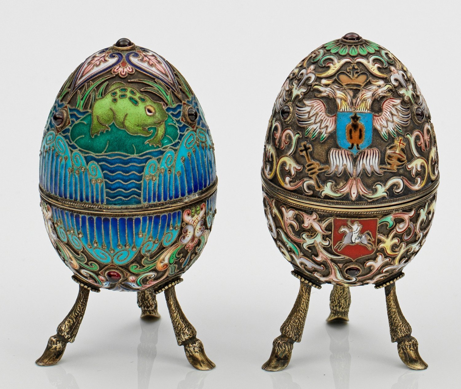 im Stil von Karl Fabergé. Silber, emailliert. Von drei hohen Klauenfüßen getragener, ovoider, mittig auseinandernehmbarer Korpus. Wandung besetzt mit Schmucksteinen und umzogen von Darstellungen eines Teiches mit Fröschen bzw. bekröntem Doppeladler und Wappenschildern. Flächendeckend ornamentaler und floraler Dekor aus polychromem Zellenschmelzemail. Innen vergoldet. Gest. 84. Gew. zus. ca. 255 g. H. 9 cm - 9,5 cm.
