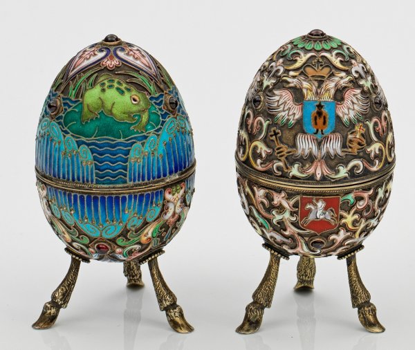 Two Russian silver and enamelled eggs in the style of Karl Fabergé. Gilt inside. Standard mark 84.