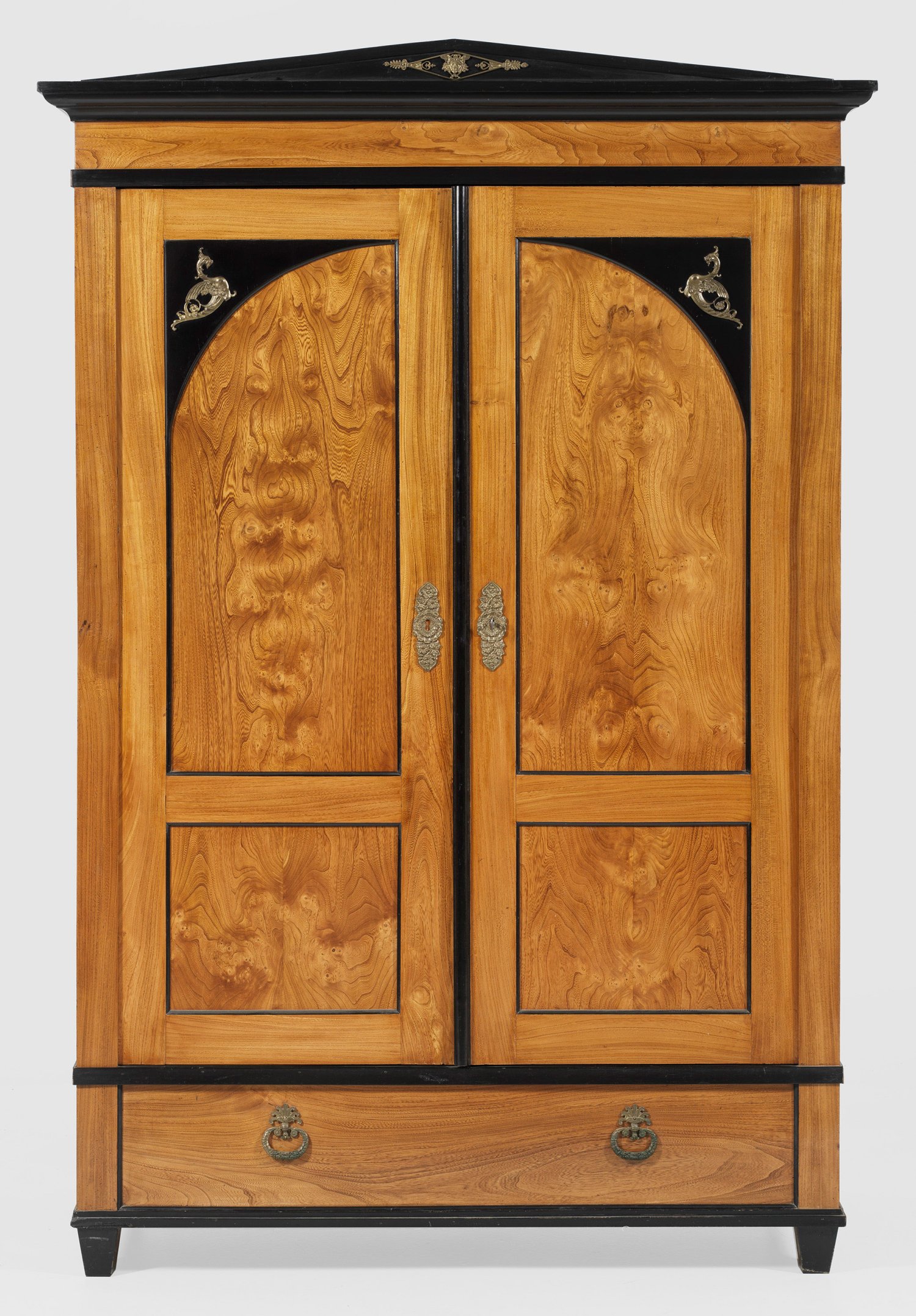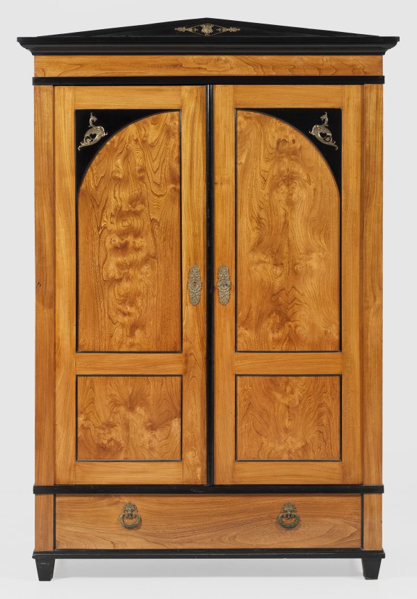 Rüster, furniert sowie teilw. ebonisiert. Gerader, hochrechteckiger Korpus auf konischen Füßen. In der gegliederten Front Blendschublade sowie zwei Türen mit applizierten Chimären. Vorkragendes Profilgesims sowie flacher Schinkelgiebel. H. 207 cm. 140 cm x 63,5 cm.