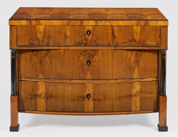 Helles Nussbaum, furniert und teilw. ebonisiert. Gerader, querrechteckig angelegter Korpus, flankiert von eingestellten Säulen. In der gegliederten Front drei breite, teilw. bombierte bzw. vorkragende Schubladen unterschiedlicher Größe. Gering überstehende Deckplatte. H. 89 cm. 123 cm x 60,5 cm.