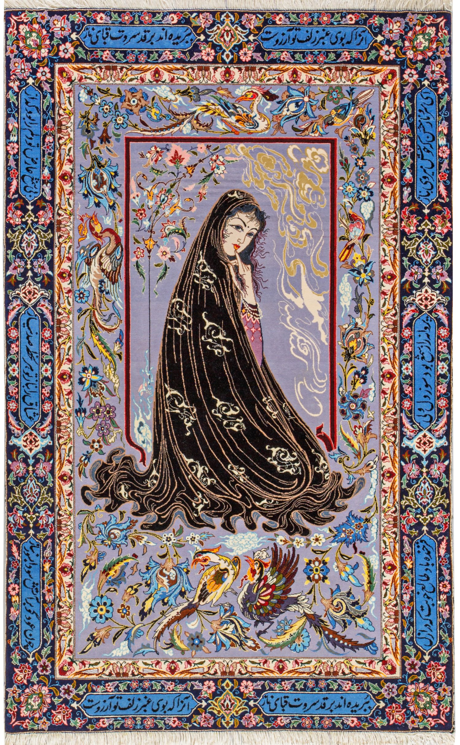 Persien. Korkwolle mit Seide auf Seide. Auf fliederfarbenem Fond Darstellung einer jungen Frau, umgeben von üppigen Palmettenranken und Phönixen. Umlaufend breite, dunkelgrundige Bordüre aus blauen Kartuschen mit Versen des berühmten persischen Dichters und Mystikers Hafi sowie reichem Blütendekor. 165 cm x 101 cm.