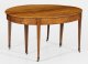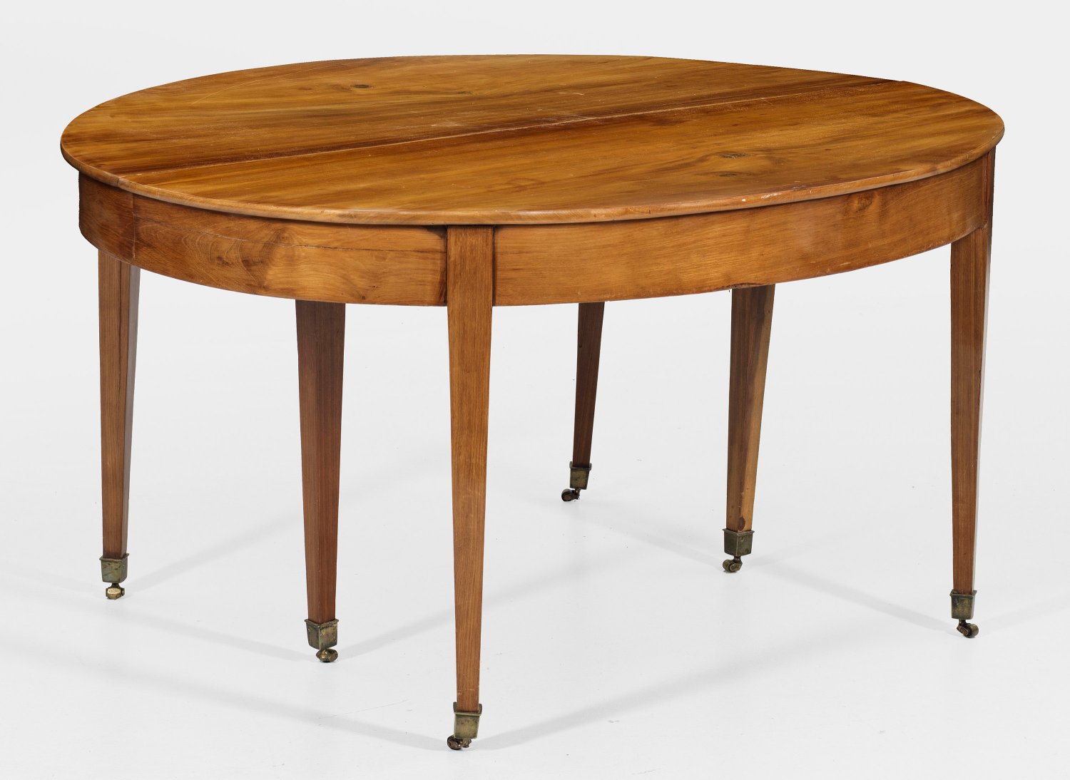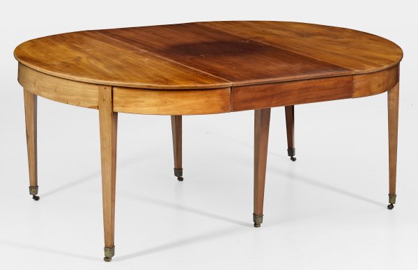 Helles Mahagoni. Bombierte Zarge auf konischen Vierkantbeinen mit Messingrollen als Träger für gering überstehende Deckplatte. Dazu eine erg. Einlegeplatte. H. 76 cm. 146 cm x 120/179 cm.