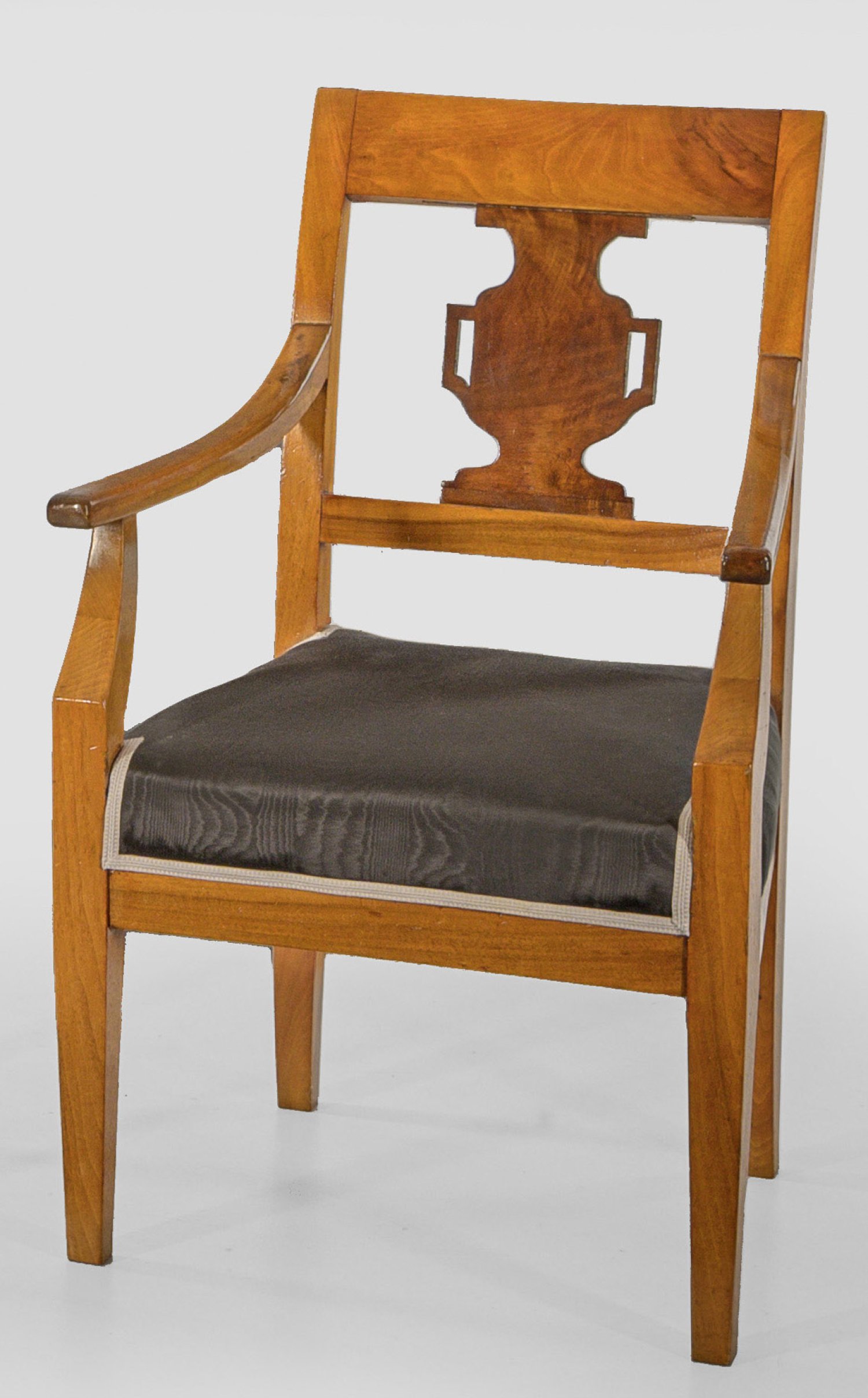 Kirschbaum, massiv und furniert. Trapezförmige Zarge auf konischen Vierkantbeinen, in gebogte Stützen für geschweift ansteigende Armlehnen übergehend. Zurückschwingende Rückenlehne mit vasenförmigem Mittelsteg. Sitzfläche gepolstert und bezogen. Unterhalb Inv.-Nr. N.132, Reste eines Etiketts "Hohenzollern' sche Hof(...)" sowie Brandstempel 8 und Wappenkartusche mit 99. H. 97 cm. 61 cm x 50 cm. Sitz-H. 45 cm.