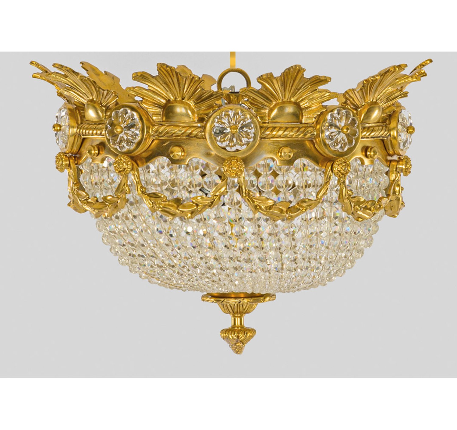 Bronze, vergoldet und farbloses Glas. Kuppelförmiger Korpus aus Prismenschnüren im Verlauf. Oberhalb breiter Reif mit Kordelbandfries und Rosetten, durch üppige Lorbeerfestons verbunden. Oberhalb Bekrönungen aus Strahlenmotiven. Innen drei Lampenfassungen. Elektrifiziert. H. 35 cm. D. 46 cm.