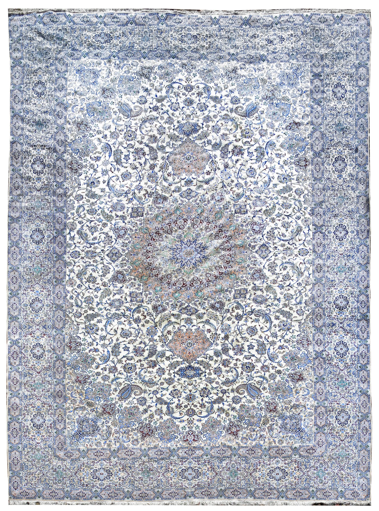 sog. Habibian-Nain. Persien. Wolle mit Seide auf Seide. Feine Knüpfung. Ca. 800.000 Knoten/qm. Im elfenbeinfarbenen Innenfeld großes, zentriert angeordnetes Rundmedaillon mit Anhängern sowie breiten Ecklösungen mit Vasenmotiven. Flächendeckende Musterung aus dicht angeordnetem Rankenwerk mit Lanzettblättern und Palmettenblüten in unterschiedlichen Blautönen. Umlaufend breite Hauptbordüre aus mit Rosetten gefüllten Reserven, flankiert von Ornamentbändern in korrespondierender Farbigkeit. Sign.; 795 cm x 493 cm.