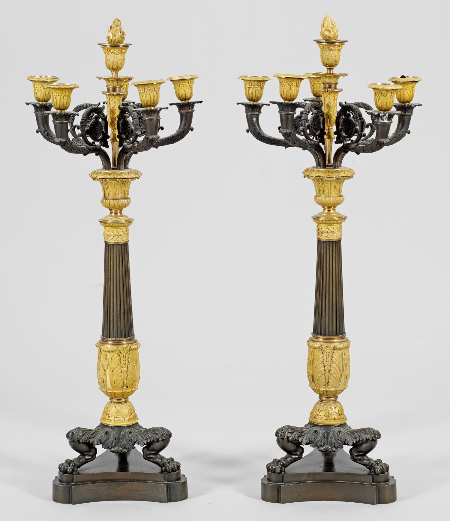 5- bzw. 6-flg.; Bronze, dunkel patiniert und teilw. vergoldet. Über dreiseitig konkav eingezogener Sockelplatte mehrfach gegliederter, umlaufend blattreliefierter, godronierter Balusterschaft auf üppigen Voluten mit Tatzenfüßen. Oberhalb davon ausgehend Vasenelement als Träger für stark geschwungene Leuchterarme aus eingerollten Blattvoluten mit vasenförmigen Tüllen. Abnehmbare Flammenbekrönung. H. 72 cm.