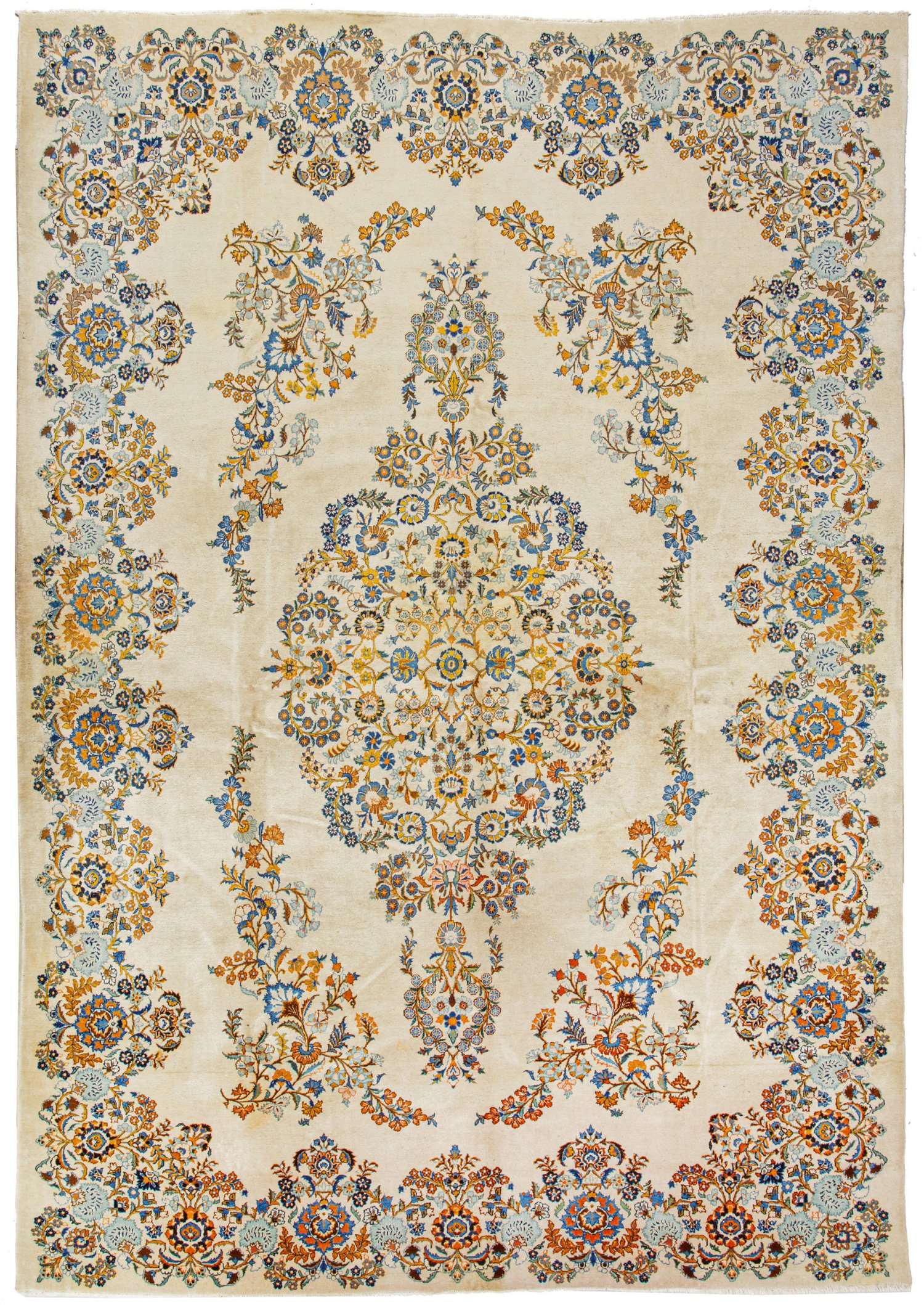 Persien. Um 1950. Wolle auf Baumwolle. Auf beigefarbenem Fond großes, offen gestaltetes Medaillon aus dicht angeordneten Blütenrispen mit Anhängern, umgeben von großen Zweigmotiven. Umlaufend breite, ebenfalls offen gestaltete Blütenbordüre. 380 cm x 270 cm.