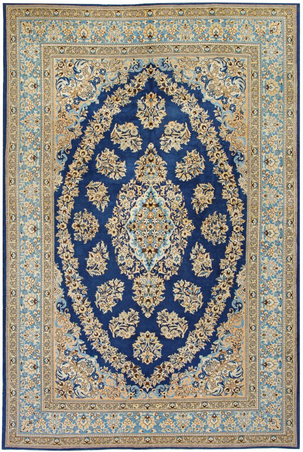 Persien. Um 1950. Wolle auf Baumwolle. Im ovalen, monochromen blauen Innenfeld gestrecktes Zentralmedaillon, umgeben von üppigen Blüten sowie Musterung aus entsprechenden Zweigen. Breite Ecklösungen. Umlaufend hellblaue Hauptbordüre aus Palmetten, flankiert von schmalen Bändern. 383 cm x 258 cm.