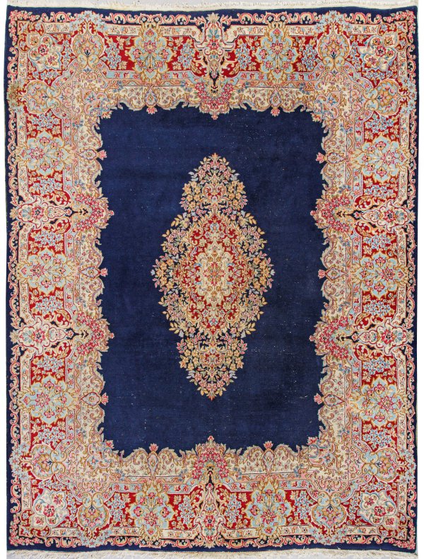 Persien. Um 1960. Wolle auf Baumwolle. Auf dunkelblauem, monochromen Fond gestrecktes Zentralmedaillon aus dicht angeordneten Blüten. Umlaufend breite, vielteilige Rahmung aus blütengefüllten Reserven, Blattwerk und Blütendolden. 330 cm x 245 cm.