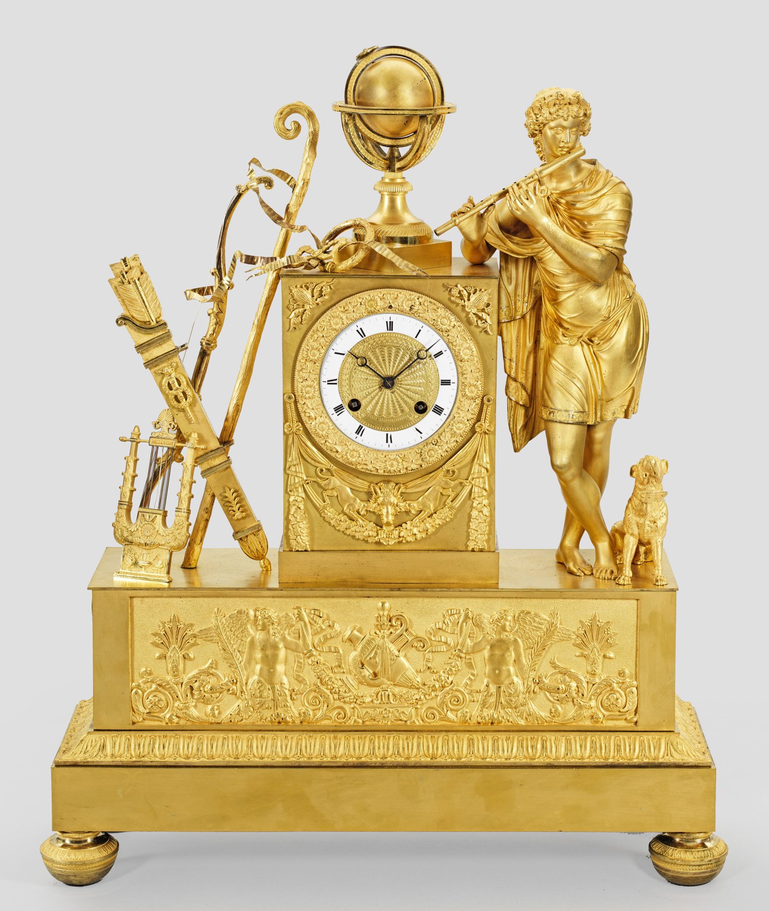 Bronze, vergoldet. Gerader, querrechteckig angelegter Sockel mit breitem Zungenfries auf Balusterfüßen. In der gegliederten Front flächendeckender Dekorfries mit erhaben reliefierten Genienfiguren und eingerollten Voluten. Rechteckiges Uhrengehäuse mit Draperiewerk und Festons sowie Bekrönung in Form eines Globus. Seitlich vollplastische Darstellung eines jungen Flötenspielers mit Hund sowie gegenüber Lyra, Hirtenstab, Köcher und Bogen. Blütengerahmtes Zifferblatt mit Emailziffernring. Pendulenwerk mit Fadenaufhängung sowie Halbstundenschlag auf Glocke. H. 63 cm. 49,5 cm x 16 cm.