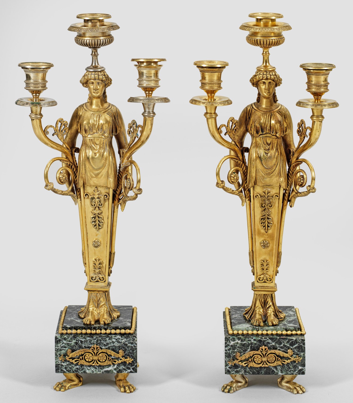3-flg.; Bronze, vergoldet sowie grün gemaserter Marmor. Über gekanteter, gestuft ansteigender Basis mit Perlstabfries und applizierten Voluten auf Klauenfüßen, weibliche Karyatide als Träger für Leuchtmittel aus stark geschwungenen Leuchterarmen mit eingerollten Voluten und vasenförmigen Tüllen. H. 47 cm.