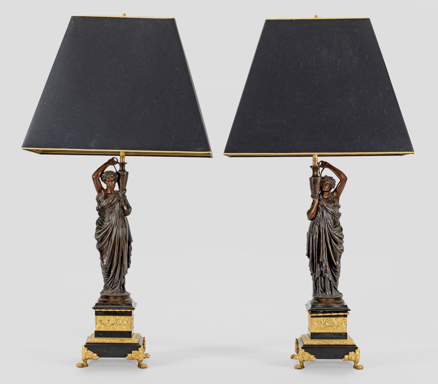 Gegenstücke. 2-flg.; Schwarzer Marmor sowie Bronze, dunkel patiniert und teilw. vergoldet. Über gestuft ansteigendem Profilsockel mit breitem Fries aus Figuren bzw. Lorbeerblatt auf Tatzenfüßen, vollplastische Darstellung einer antikisierenden Wasserträgerin. Davon ausgehend schlanker Schaft als Träger für Leuchtmittel. Gekanteter, konischer Lampenschirm. Elektrifiziert. Bez. H. Ferrat. H. 97 cm.