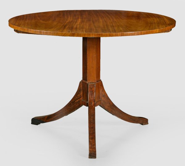 Mahagoni, furniert. Über konischen, geschweift ansteigenden Beinen, gekanteter Schaft als Träger für runde, abklappbare Deckplatte. H. 75 cm. D. 105 cm.