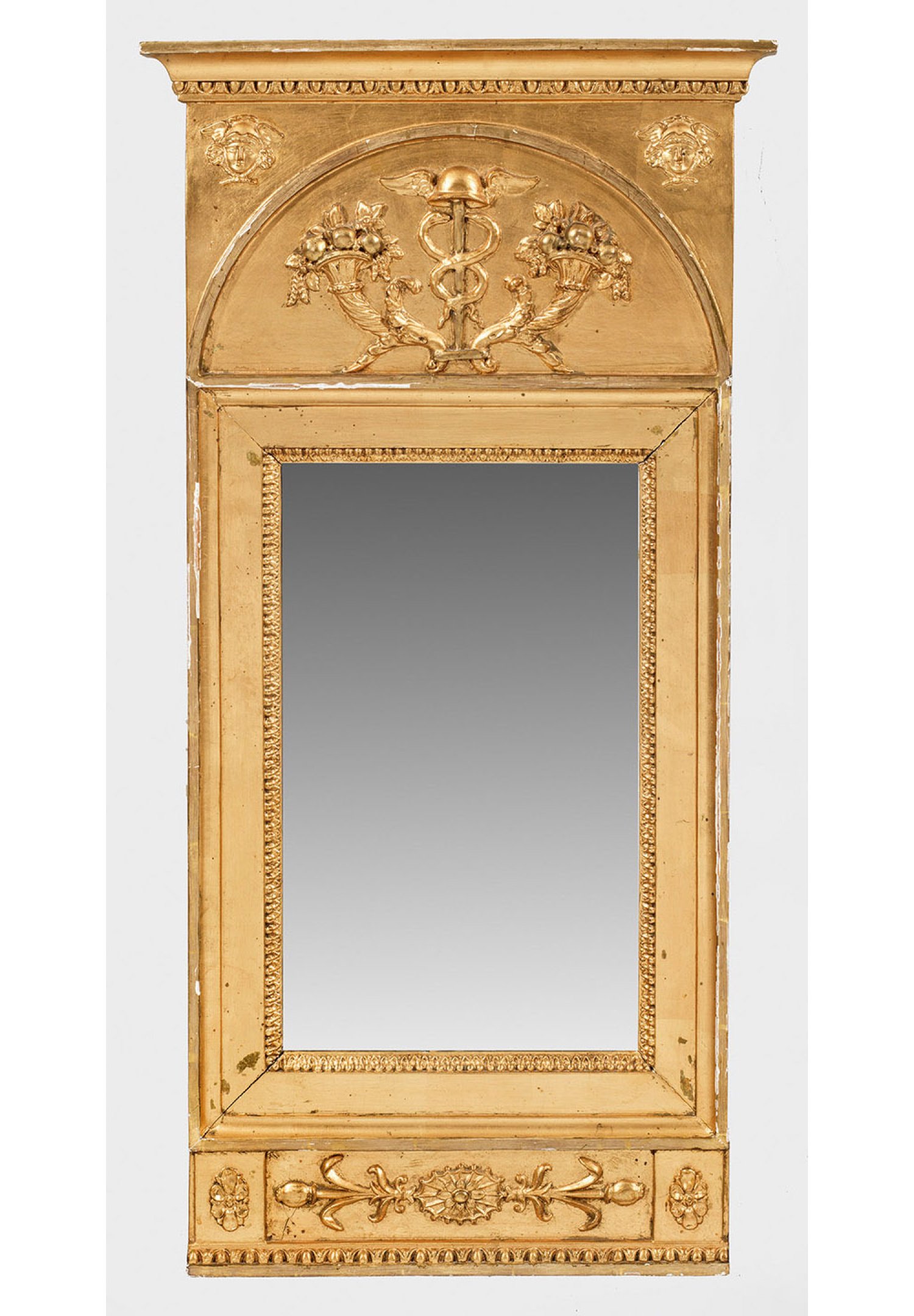 Holz, stuckiert, gefasst und vergoldet. Hochrechteckige, profilierte Spiegelrahmung mit Palmettenfries. Im breiten Giebelfeld stilisierter Segmentbogen mit erhaben reliefierten Füllhörnern sowie kleinen Maskarons. Oberhalb schmales Gesims. 90 cm x 46 cm.