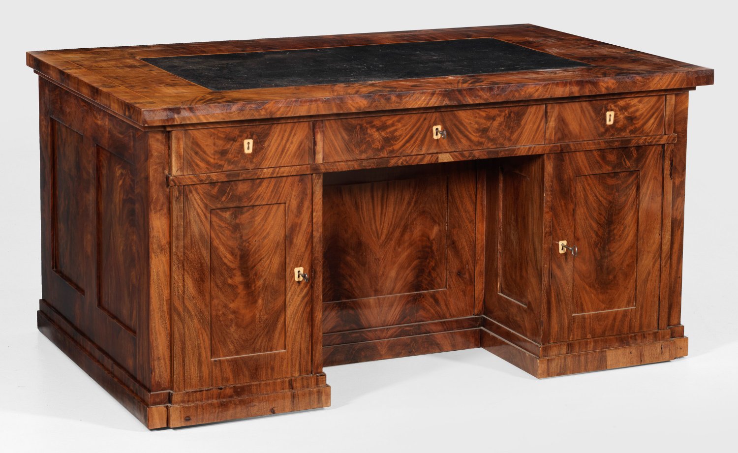 Mahagoni, furniert. Gerader, querrechteckig angelegter Korpus aus breitem Kniefach mit zurückgesetzter Lade, flankiert von je eintürigen Podestelementen. Dahinter einmal Schubladeneinteilung. Seitlich je eine Geheimtür. Oberhalb breites Schubfach sowie gering überstehende Deckplatte mit eingelegter Arbeitsfläche aus Leder. Schauseitig flächendeckende Furnierfelder. H. 76 cm 153 cm x 98 cm.