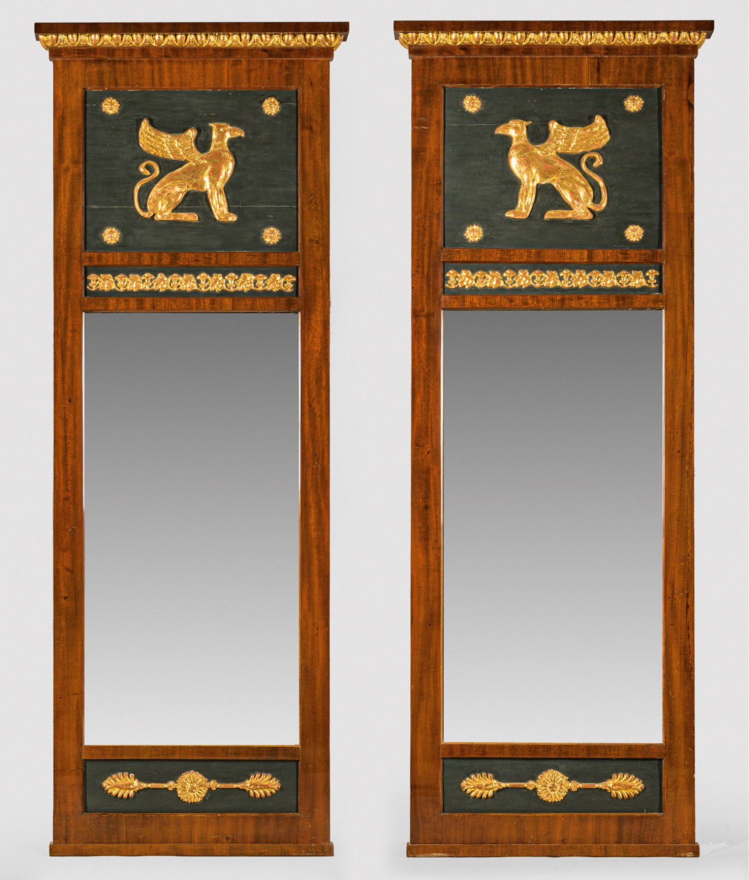 Gegenstücke. Mahagoni, furniert bzw. schwarz-grün gefasst sowie stuckiert und vergoldet. Gerade, hochrechteckige Spiegelrahmung. Im breiten, zweigeteilten Giebelfeld ornamentierter Blattfries sowie erhaben reliefierte Chimären und Rosettenmotive. Oberhalb schmales Gesims aus Eierstabfries sowie korrespondierender unterer Abschluss mit zentraler Rosette und Palmetten. 174 cm x 64 cm.