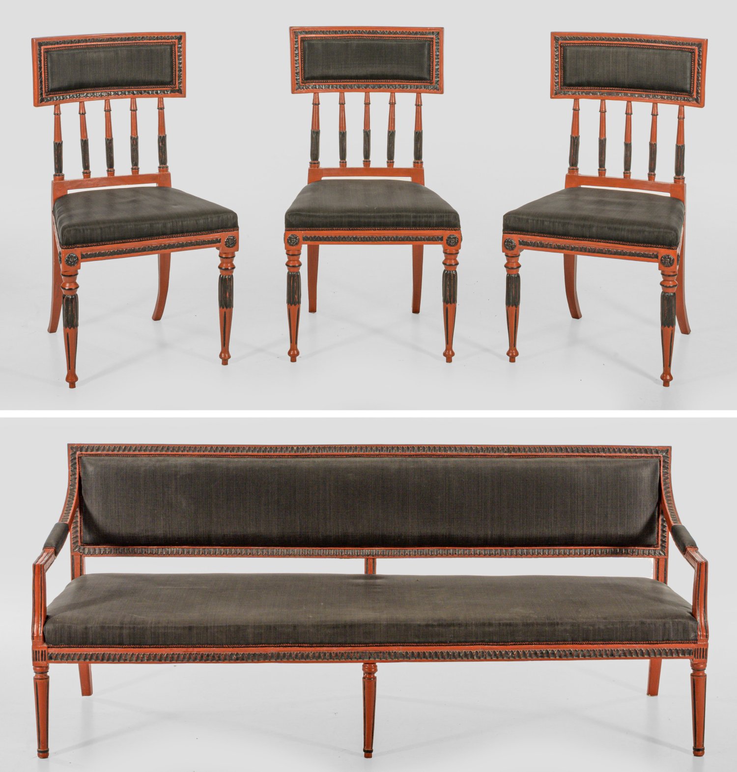 Holz, siegelrot gefasst und teilw.geschwärzt. Gerade, profilierte Zarge auf gegliederten Balusterbeinen. Kurze Stütze für schmale, geschweift ansteigende Armlehnen sowie breite, rechteckige Rückenlehnenrahmung. H. 86 cm. 197 cm x 62 cm. Sitz-H. 41 cm. Trapezförmige Zarge auf mehrfach gegliederten Balusterbeinen. Rechteckige Rückenlehnenrahmung aus Balusterstäben und gewölbtem oberen Abschluss. Gepolstert und bezogen. Sitz-H. 43 cm.