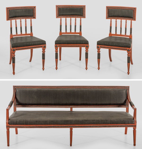 Lot 1566: Große gustavianische Sofabank und drei Stühle