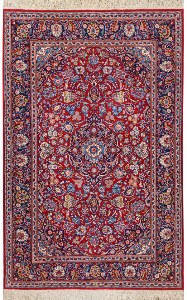 Persien. Korkwolle mit Seide auf Baumwolle. Im roten Innenfeld dunkles Zentralmedaillon mit Anhängern sowie breite, passig geschweifte Ecklösungen. Flächendeckende Musterung aus Blütenranken. Umlaufend breite, dunkelblaue Palmettenbordüre, flankiert von schmalen Bändern. Sign.; 188 cm x 122 cm.