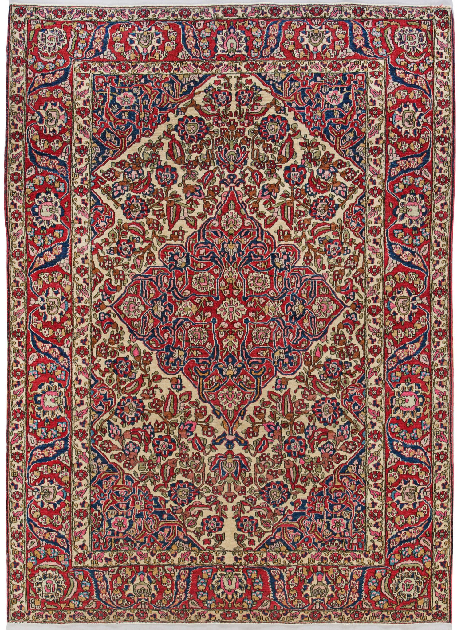 Persien. Um 1940. Wolle auf Baumwolle. Im cremefarbenen Innenfeld großes, rot-blaues Rautenmedaillon und entsprechende Ecklösungen. Flächendeckend dichte Musterung aus Rankenwerk. Umlaufend breite Bordüre aus Palmetten und Blattwerk. 200 cm x 140 cm.