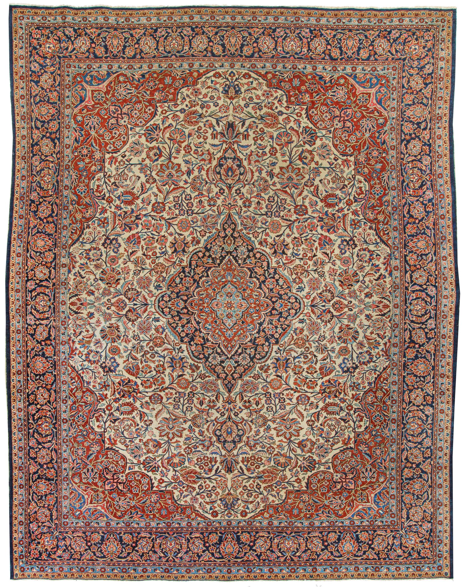 Persien. 1920er-1930er Jahre. Wolle auf Baumwolle. Im elfenbeinfarbenen Innenfeld großes, dunkelgrundiges Zentralmedaillon mit Anhängern sowie breite, rotgrundige Ecklösungen. Flächendeckend dicht angelegte Musterung aus Palmettenranken. Umlaufend breite, dunkelgrundige Palmettenbordüre, flankiert von schmalen Bändern. 380 x 280 cm.