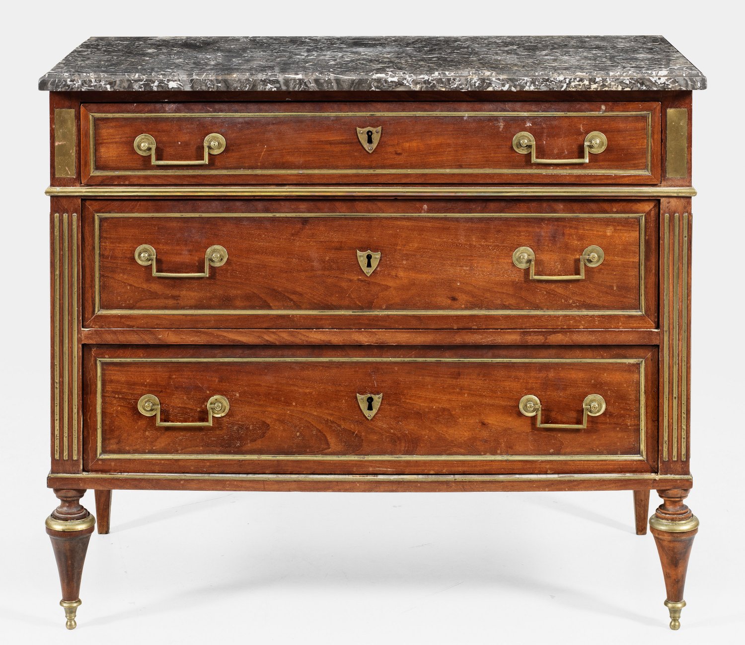 Mahagoni, furniert sowie Profile und Einlagen aus Messing. Gerader, querrechteckig angelegter Korpus, flankiert von Pilastern mit godronierten Streben auf spitz zulaufenden Balusterbeinen. In der gegliederten Front drei profilierte Schubladen unterschiedlicher Größe. gering überstehende Deckplatte aus dunkelgrauem, weiß gemasertem Marmor. H. 84 cm. 95,5 cm x 48 cm.