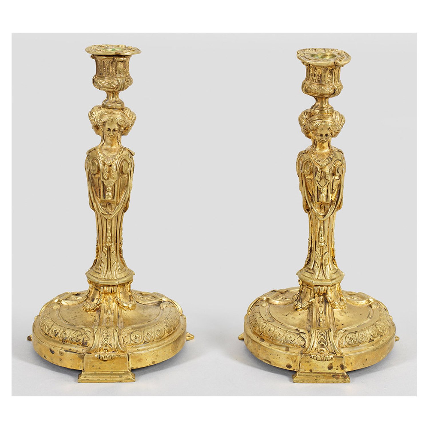 1-flg.; Bronze, vergoldet. Über geschweift ansteigendem Rundsockel mit breiten Volutenmotiven und Rosettenfries gegliederter Balusterschaft aus gegeneinander gestellten Hermenfiguren. Oberhalb vasenförmige Tülle. H. 30 cm.