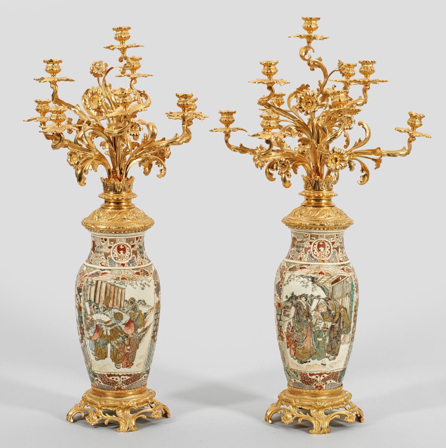 A pair of large gilt bronze French candelabras with Japanese vases.