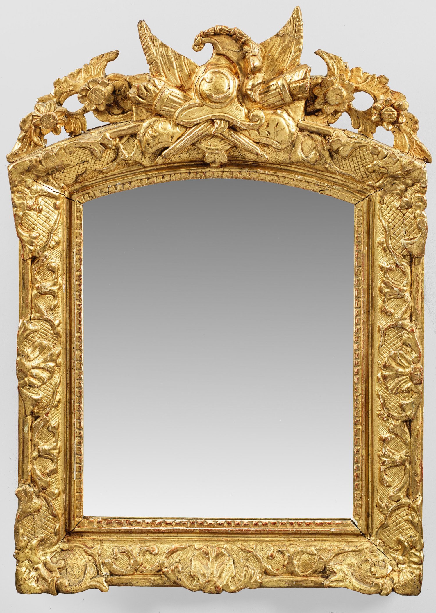 Holz, geschnitzt, gefasst und vergoldet. Hochrechteckige, profilierte Spiegelrahmung aus Volutenmotiven, Gitterwerk und Reserven mit gewölbtem oberen Abschluss. Bekrönung aus stilisierten Attributen des Krieges, flankiert von Blütenmotiven. 66 cm x 48 cm.