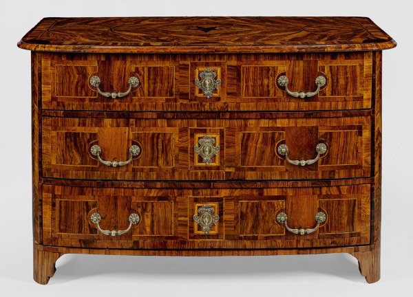 Nussbaum, furniert. Gerader, querrechteckig angelegter Korpus, flankiert von gerundeten Ecklisenen, in entsprechende Füße übergehend. In der gegliederten Front drei breite, leicht bombierte Schubladen. Weit überstehende, profilierte Deckplatte. Flächendeckend breit gerahmte Furnierfelder, auf der Platte von geschwungenen Bandeinlagen begrenzt. Mittig eingelegter Stern. Schubladenkorpi erg.; H. 82 cm. 129 cm x 62 cm.