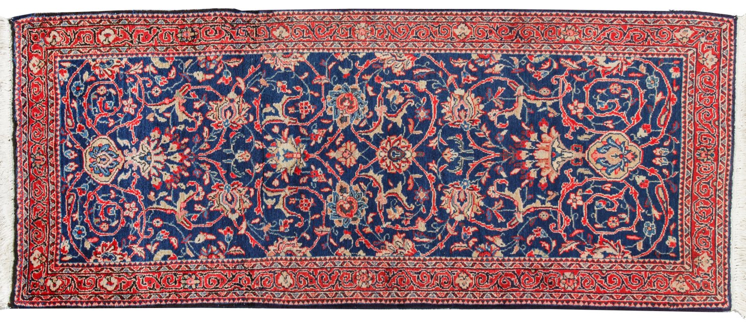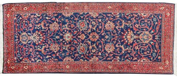Persien. Wolle auf Baumwolle. Im blauen Innenfeld flächendeckende Musterung aus großen Palmettenranken. Umlaufend mehrteilige Bordüre in unterschiedlichen Rottönen. 196 cm x 80 cm.