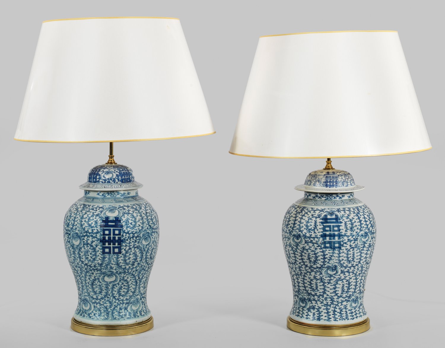 2-flg.; Porzellan. und Messing vergoldet. Balusterförmiger Korpus mit aufgewölbtem Deckel. Flächendeckender, stilisierter Dekor aus Rankenwerk in unterglasurblauer Malerei. Umlaufende Mäanderbordüre. Oberhalb schlanker Schaft als Träger für Leuchtmittel. Konischer Lampenschirm. Elektrifiziert. H. 81 cm.